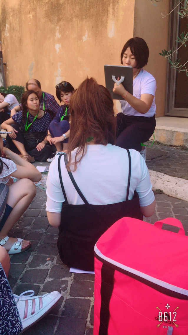 우린 이렇게 작은 뜰에 모여 앉아 언니의 설명을 들었다. 언니는 20대 후반쯤 되어보였는데 타고난 입담과 재치가 있는 분이었다. 개그우먼 신봉선을 닮은 것 같다며 키득거리기도 했다. 언니는 가방 속에서 너덜거리는 각종 사진과 자료들을 꺼내 일일이 한 명씩 눈 앞에 갖다 대어주었고, 최신 문물인 화면이 큼직한 아이패드에서 선명한 자료 사진들을 바로바로 터치해내었다.