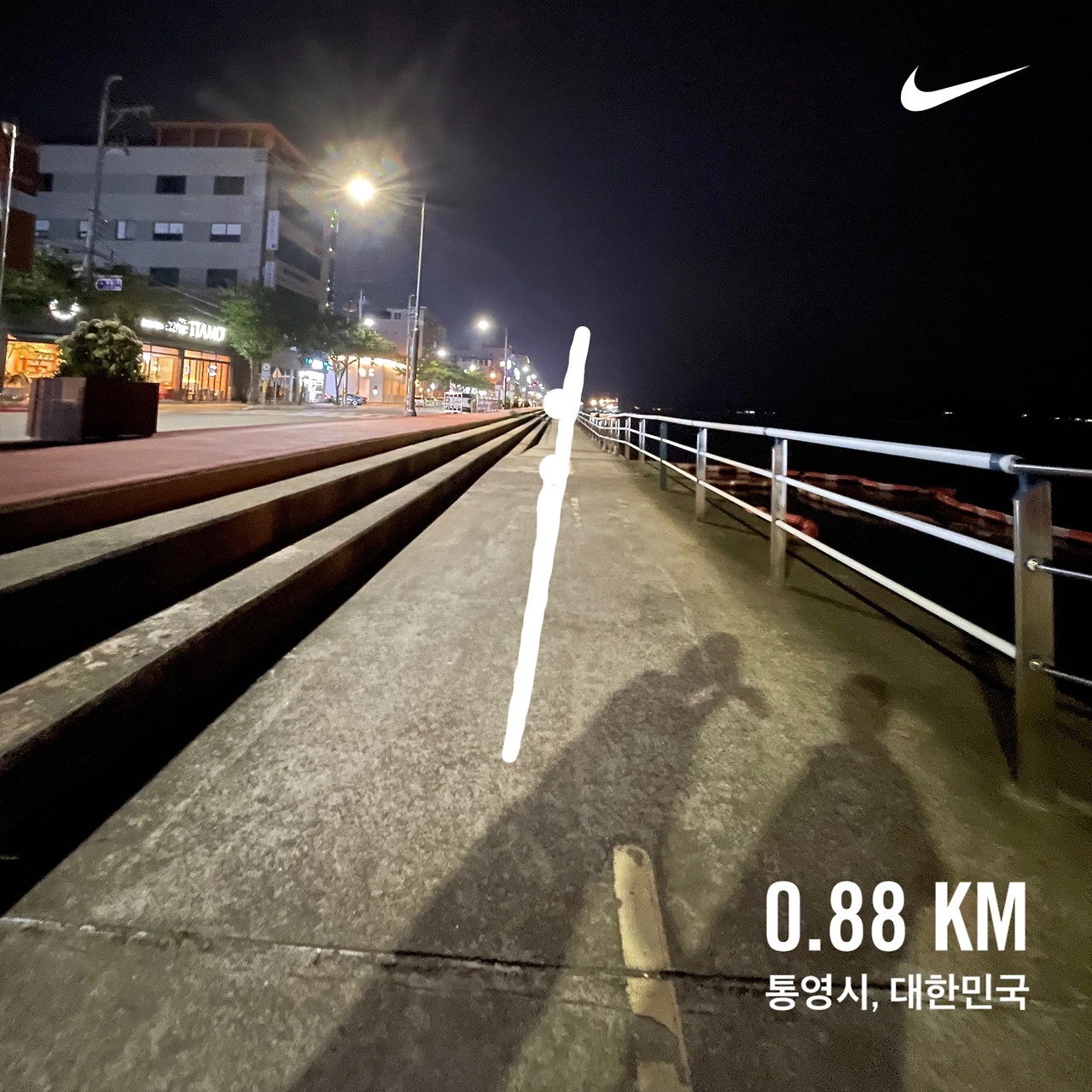 숙소 바로 앞에서 밤바다를 산책할 수 있는 것도 큰 장점이었다. 자전거 도로와 도보가 함께 있어 많은 통영 시민들이 아침저녁으로 운동을 하는데, 일시적 통영 거주민 2명도 함께 열심히 걸어보았다.