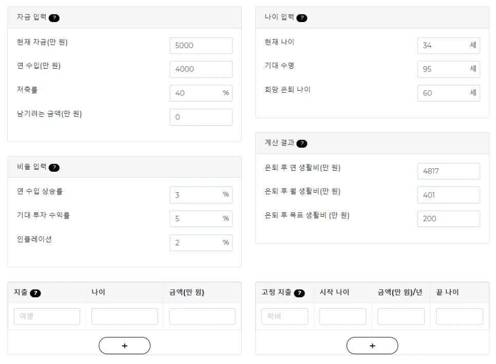 여러분의 은퇴 후 금액을 계획할 수 있는 경제적 자유 계산기입니다. 목표하는 은퇴 시기와 수입, 지출 등을 설정하고 값들을 조정하여 경제적 자유를 달성할 수 있는 시기와 금액을 알 수 있습