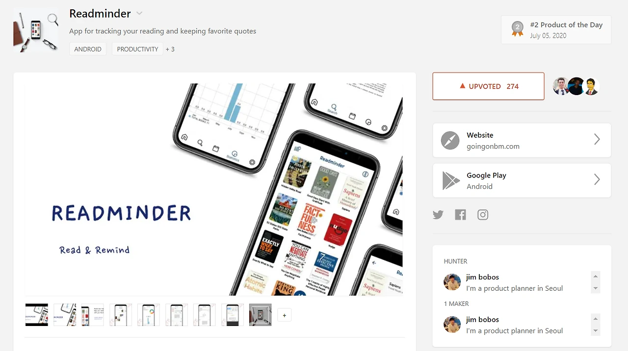 . 그러던 중 앱 개발과 관련된 책에서 발견한 '프로덕트 헌트(Product Hunt)'라는 웹사이트에 리드마인더 소개를 올렸고 유럽의 여러 국가에 기사로까지 실리게 되었