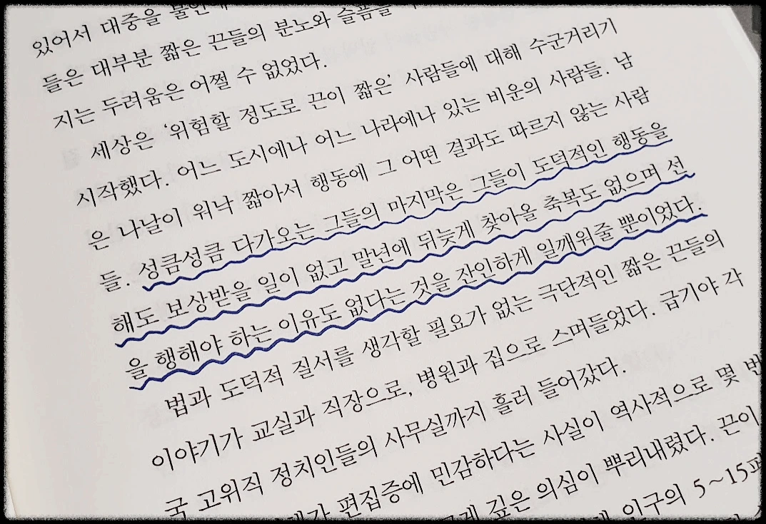 소설은 수명이 얼마 남지 않은 사람들인 짧은 끈과 긴 끈을 가진 사람을 나누어 이들의 삶이 변해가는 모습을 적나라하게 표현한다. 책을 읽으면서 나오는 각각의 등장인물에 감정을 이입하여 나는 어떤 행동이나 생각을 했을까라고 상상해 봤다. 그러면 몇 페이지 넘기지 않아 내가 생각한 그 모습들과 감정들이 글로 표현되어 있었다. 작가의 상상력과 고민의 정도가 어느 정도였을지 짐작되는 부분이다.