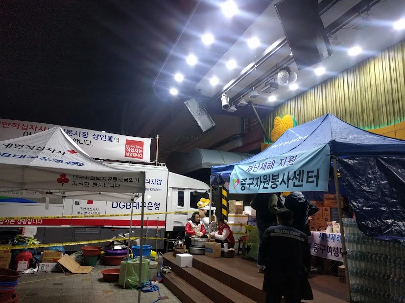 기부금도 정말 중요한 역할을 했지만 무엇보다 더 핵심적인 역할을 했던 사람들이 있다. 재난 발생 당일부터 화재 진압 및 주변 정리에 힘든 소방관을 포함한 국가직 공무원들과 이들을 지원하기 위해 발 벗고 나서서 봉사활동을 한 시민들이었다. 지금은 기사로 밖에 판단할 수 없고 기사조차도 접속되지 않은 링크 주소도 많아 정확한 사실을 확인하기 힘들어 아쉽다. 당시 상황이 급박했던 만큼 서문시장은 경찰과 소방관들로 둘러싸여서 밤새도록 작업을 이어나갔고 시장 내 조그마하게 만들어진 지원본부와 봉사센터에서는 그들을 위해 식사 및 지원품을 관리했다. 더불어 한편에는 기부를 받는 공간이 있었는데 그곳에는 빵, 우유, 즉석밥, 떡, 핫팩 등 시민들이 기부하고 간 다양한 물품들이 쌓여있었다.