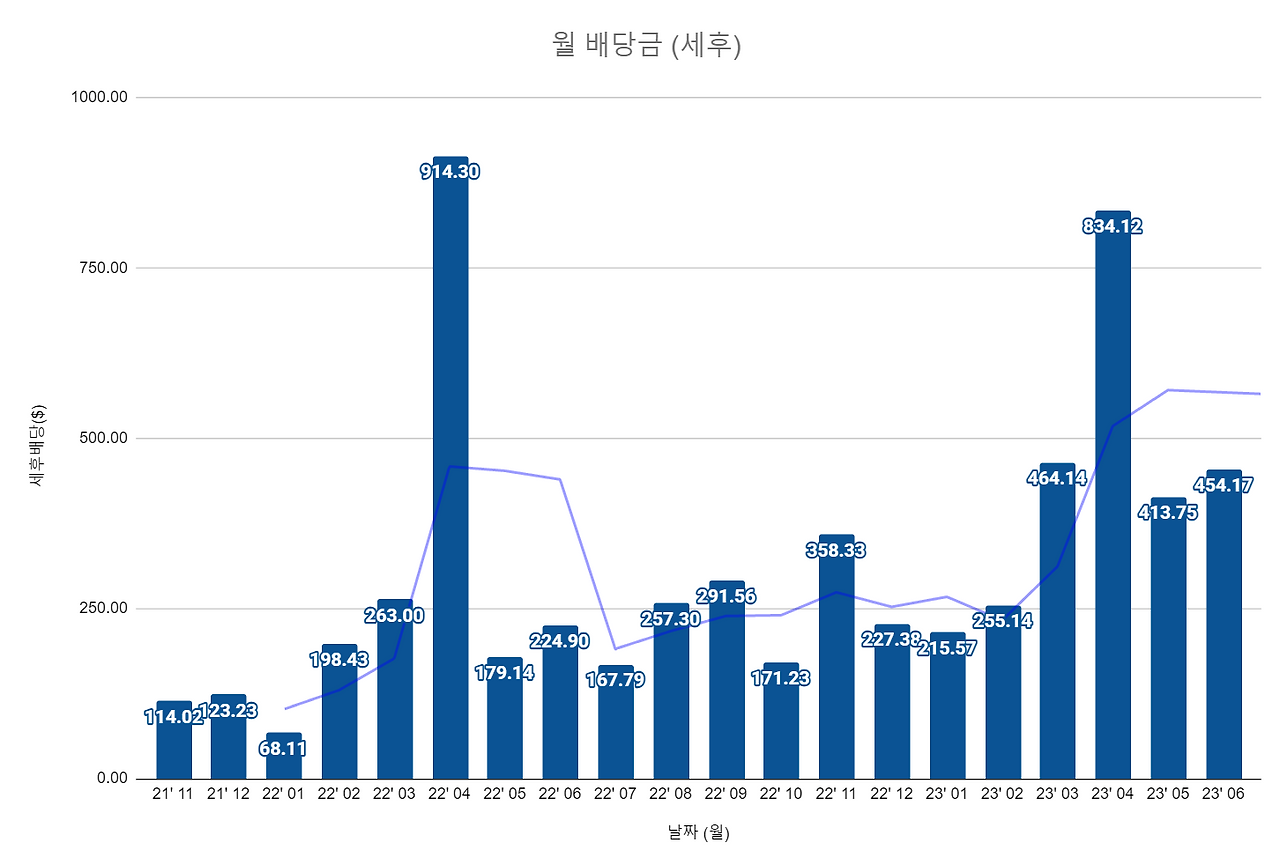 앞으로도 세금을 제외한 후 400 달러에서 500 달러 내외의 배당금을 수령할 것이고 앞으로도 계속 상승할 것