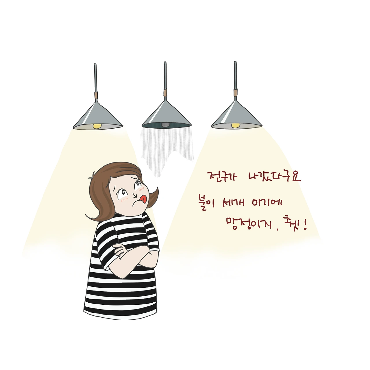 식탁 위 전등 3개 중 가운데 등이 깜깜해졌다. 전구가 나갔나 보다. 쟁여놓기를 좋아하지만 전구까지 쟁여놓고 살지는 않는터라, 어쩔 수 없이 복도 천장에 있던 전구를 하나 빼서 꽂았다. 나머지 둘은 노란빛, 복도에서 빌려온 등은 하얀빛. 뭔가 좀 이상하고 복도도 어두워지긴 했지만 그래도 컴컴한 식탁 아래서 밥을 먹는 것 보다는 낫다.