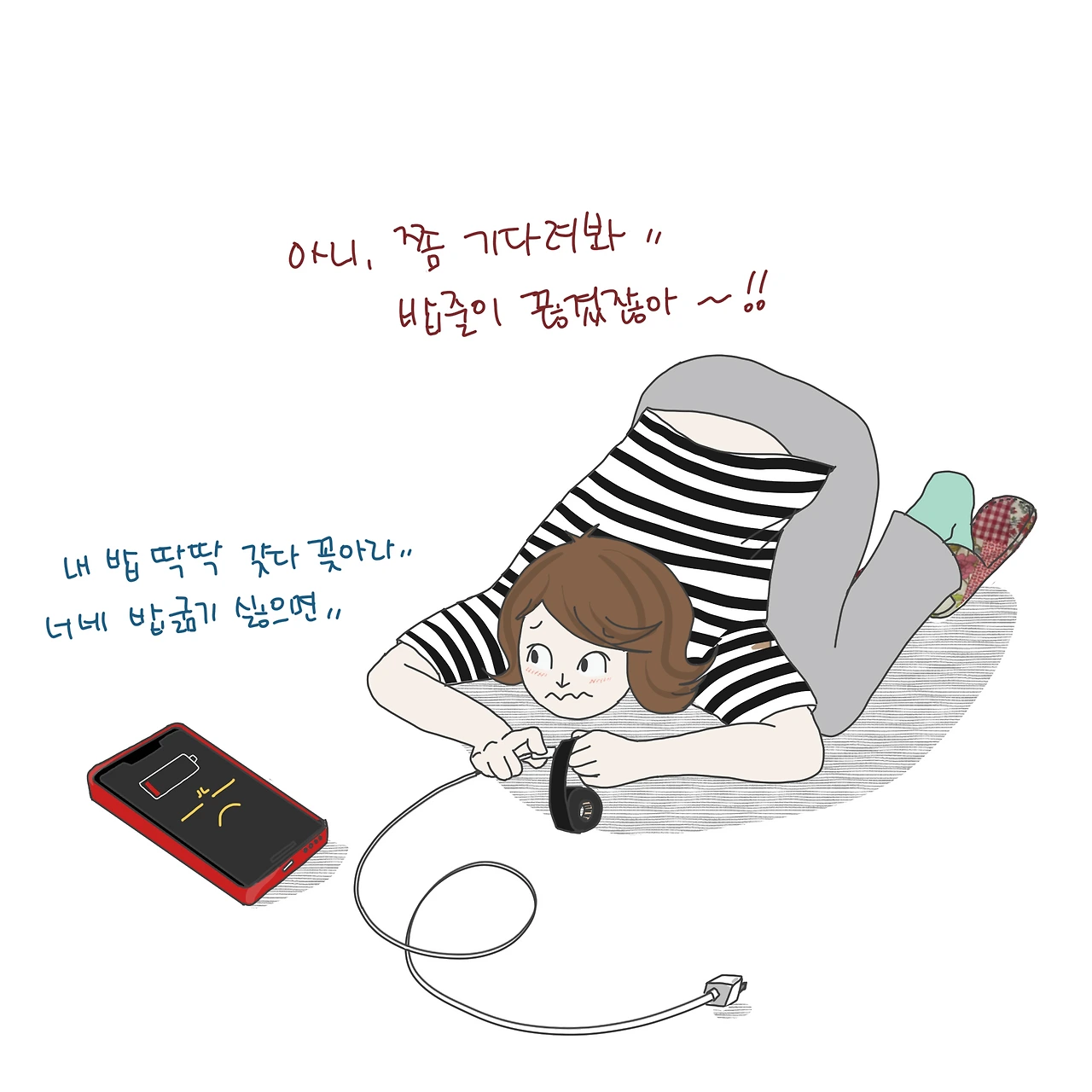 봉쇄 전보다 더 핸드폰 사용시간이 길어졌다. 이제 정말 핸드폰이 왼쪽 손바닥에 붙어있음 편하겠다 싶을 정도다. 늘 업무에, 공구 소식에 카더라 통신에 핸드폰 화면만 괴롭히다 보니 배터리는 금방 배가 고프다며 빨간불을 울리기 일쑤고, 늘 가족 중 누군가의 핸드폰에 꽂혀있어야 하는 충전선이 나를 죽여달라 항의라도 하는 듯 머리를 덜렁덜렁 거린다. 미안하다, 충전 선아. 물류가 정상화되기 전까지는, 혹은 상점들이 정상으로 문을 열기까지는 넌 죽으면 안 된단다. 의료용 테이프, 스카치테이프, 집안의 온갖 끈끈이 테이프는 다 가져다 깁스라도 시키듯 충전선 머리를 칭칭 감아두었다. 조금만 견뎌다오, 네가 없으면 나는 봉쇄가 아니라 정말 고립이 된단다.