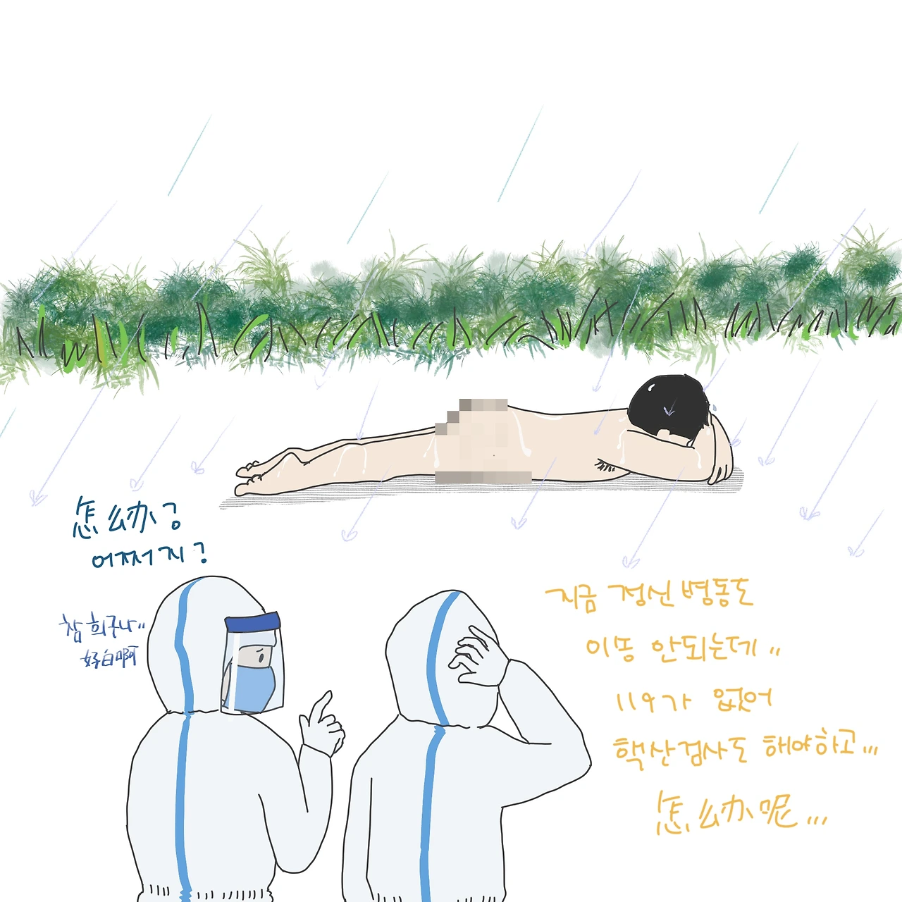 -전철역 다 막혀서 못 들어가. 게다가 옷 벗고 길거리 돌아다니는 건 우리 여러 명 봐봤잖아. 보기 좀 그렇더라.