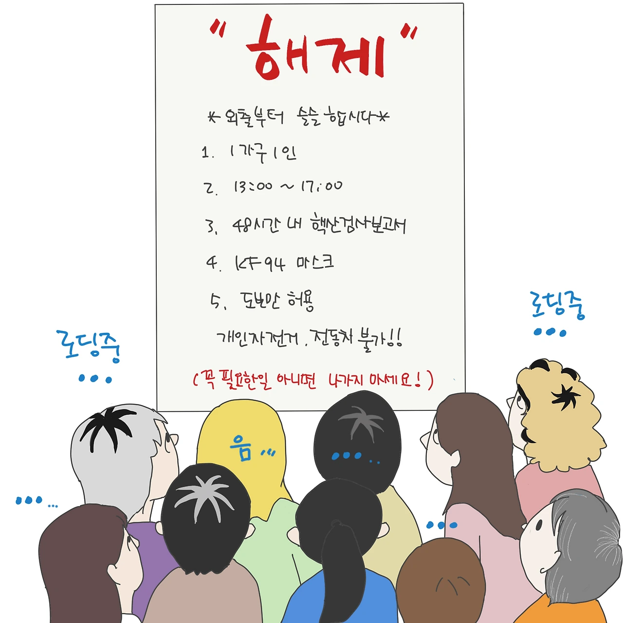 외출 허가증을 놓고 평소에도 의견 내놓기를 좋아하던 몇몇 사람들은 느낌표를 쿵쿵 찍어가며 역시 나가지 않는 게 좋겠다는 의견을 몰아갔다. 물론 먼저 외출이 허용된 아파트에서 다시 확진자가 발생하는 사례도 있으니 틀린 말은 아니다. 하지만 그럼에도 불구하고 대부분의 사람들은 조용히 KF94 마스크를 꺼내 들고 60일 만의 설레는 외출을 준비하고 있을 것이다. 어차피 필요하든 하지 않든 공구는 넘쳐나고 단지 안의 지저분하지만 물자가 충분한 식품점 덕분에 먹을 것을 바리바리 짊어지고 돌아올 일도 없으니.