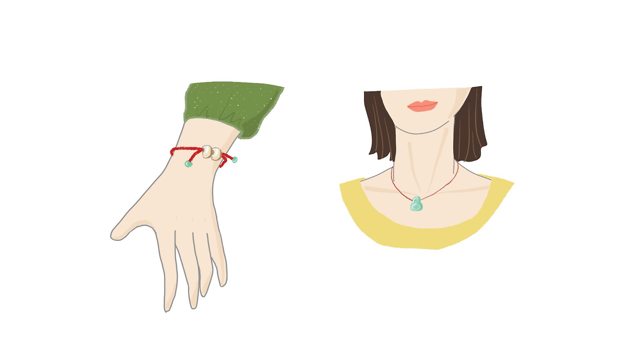 금딱지 장식품을 달고 있는 붉은 실팔찌나 고급진 옥장식을 달고 있는 붉은 실 목걸이,