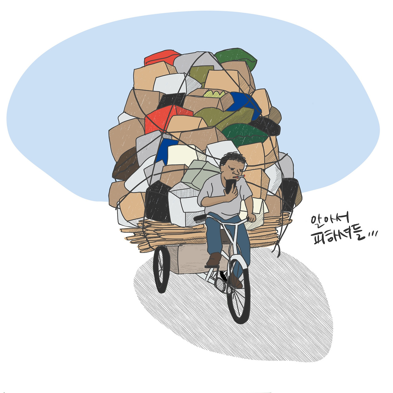 부실해 보이는 리어카에 산더미만큼 짐을 싣고 핸드폰을 손을 쥔 채 앞도 안 보고 주행하시는 신통 방통 재주꾼 폐품 수거 아저씨나