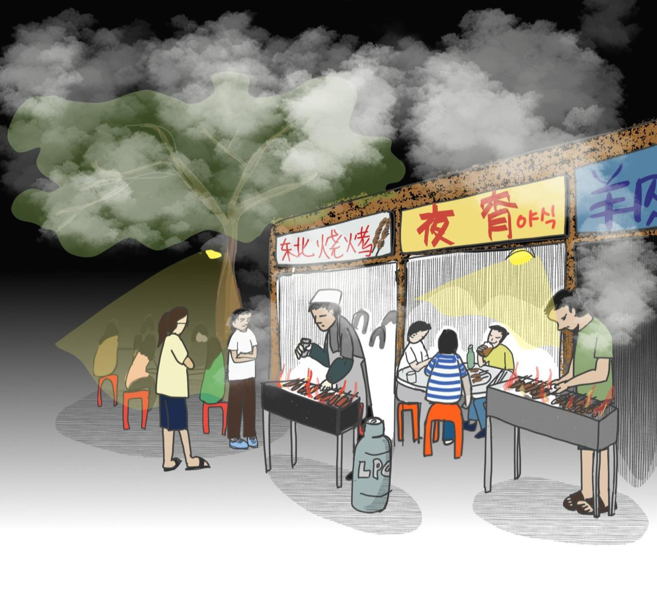 밤만 되면 온 길거리 자욱하게 불이라도 난 듯 연기를 피워내며 자글 자글 양꼬치, 온갖 야채들을 구워내던 노점상들과