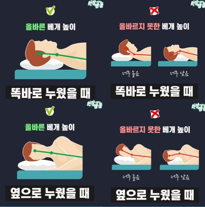 해가 거듭날수록 정형외과를 다니는 직장 동료들이 늘었다. 바로 경추 디스크와 거북목의 통증 탓이다. 하루 8시간 이상을 컴퓨터 앞에서 고개 숙여 일하는 직장인들에게는 허리 디스크 문제만큼이나 흔한 질환이다. 잘못된 자세가 원인이지만 수면 또한 한몫을 한다. 일하는 시간 못지않게 긴 수면 시간 동안 자세가 좋지 않으면 이 상황은 점점 더 악화되어 간다. 정상적인 목은 누워 있을 때는 목의 S자 곡선이 만들어져야 하고, 옆으로 누웠을 때는 일자로 편안한 목이 유지가 되어야 승모근과 거북목이 되지 않는다. 이미 거북목이 되었다고 해도 좋은 수면 자세는 자는 동안 목이 스트레칭되면서 많이 완화가 된다.