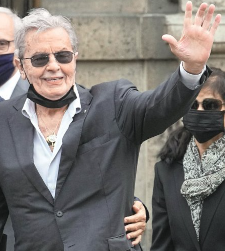 프랑스 배우 알랭 들롱(선글라스 낀 사람)이 2021년 9월 파리의 한 장례식장에서 사람들을 향해 손을 흔들고 있다. 파리=AP 뉴시스그는 인터뷰에서