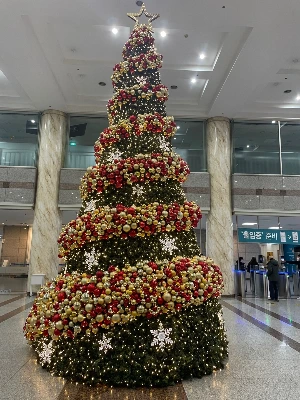 아직 해가 뜨지 않아 밖은 어두웠지만 로비의 크리스마스트리가