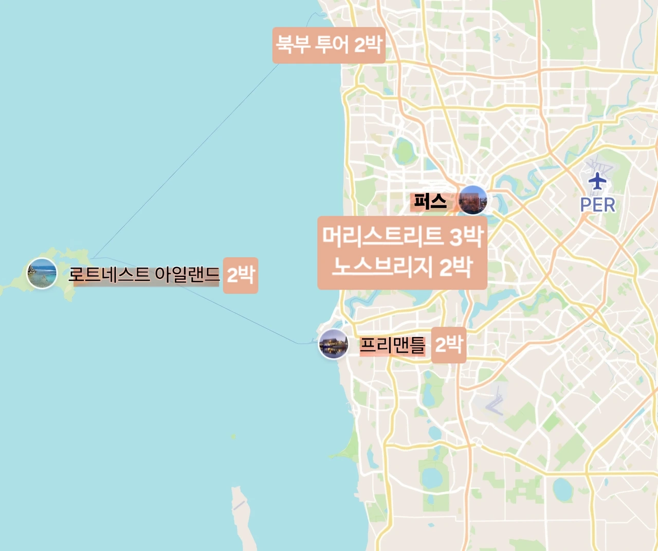 다 나름의 조건과 이유가 있는 결정이다. 프리맨틀에서 숙박하며 여유 부려보고 싶은 데다 로트네스트 섬 입도에 유리하니 프리맨틀 2박, 로트네스트에서 쿼카와 유유자적하고 싶으니 섬에서 2박, 북부 투어 전에는 투어 모임 장소인 퍼스 역 근처에서 묵는 것이 편리한데다 시내 곳곳을 걸어 다니고 싶으니 머리 스트리트 3박, 투어 마치고 늦은 밤 빠른 귀가를 위해서 퍼스 역 바로 위 노스브리지 2박.