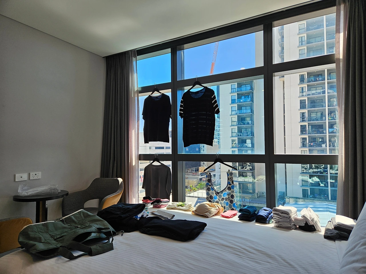 세탁을 하고 나니 마음이 든든해졌다. 사실 빨래방이 호텔에 있는 것이 가장 좋았을 테지만, 그렇지 못해 걱정을 꽤 했던터라 세탁 문제를 해결하니 기분이 좋아졌다. 건조기에 돌린 옷들은 착착 접어 정리하고, 건조기를 못 돌린 옷들은 서향으로 난 창문 문틀에 옷걸이를 걸어서 바짝 마르게 두었다.
