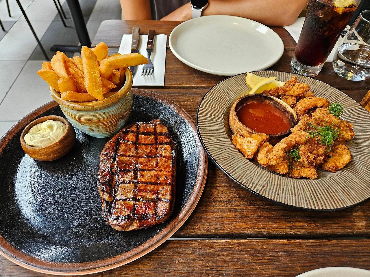 바람이 솔솔 부는 야외 좌석에 자리를 잡았다. 직원의 안내에 따라 메뉴판을 뒤적여 보았다. 직원의 추천은 고마웠지만, 멘트를 알아듣겠다고 집중하다가 끝내 멘붕에 빠졌다. 영어 앞에서는 금방 진이 빠져버리고 의욕 상실 상태가 되어버리는 우리. (이쯤 되면 나의 여행기는, 영어 못해 서러운 한국인의 심정 토로 일기) 배가 많이 고프지는 않아서 적당히 스타터로 깔라마리를 고르고, 립아이스테이크를 하나 시켰다. 메뉴가 차례로 나왔다. 칼라마리는 부드럽고 촉촉하니 소스와도 잘 어울려 맛있었다. 스테이크는 칼바리 투어 때 가이드님이 구워주신 소고기만 못하다는 느낌도 들고, 제로 콜라는 얼음 때문인지 탄산이 거의 빠져 있고. 좀 아쉬운 맛이었다.