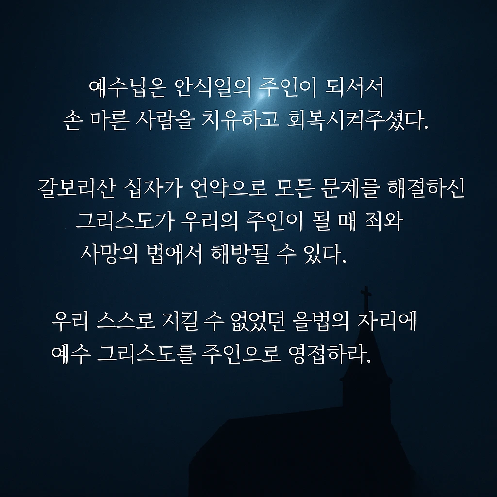 우리가 스스로 지킬 수 없었던 율법 자리에 안식일의 주인이신 예수 그리스도를 영접하면
