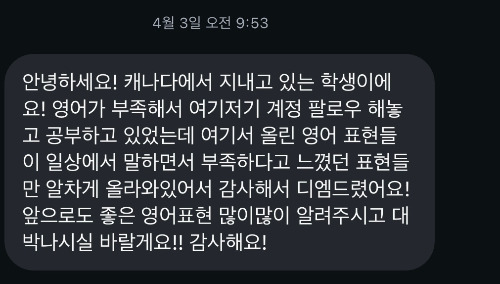 캐나다에서 지내고 있는 학생이에요! 영어가 부족해서 여기저기 계정 팔로우 해놓고 공부하고 있었는데, 여기서 올린 영어 표현들이 일상에서 말하면서 부족하다고 느꼈던 표현들만 알차게 올라와 있어서 감사해서 DM드렸어요!