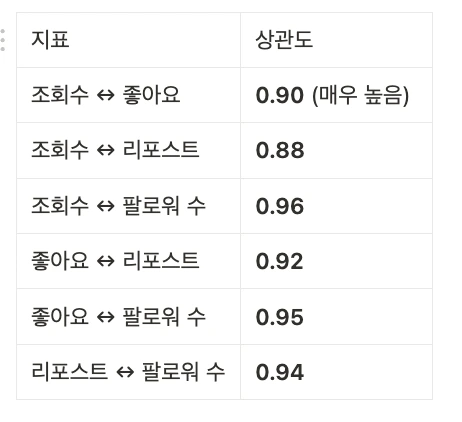 특히 주목할 점은 조회수와 팔로워 수의 상관관계가 0.96에 달했다는 점입니다. 즉, 임팩트 있는 콘텐츠가 더 많은 노출을 이끌고, 그 결과 채널 성장으로 이어진다는 구조를 확인할 수 있었습니다.