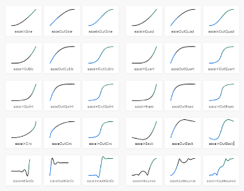 컴퓨터 공학자들은 이 함수를 간편하게 사용하기 위해 규칙을 만들고 이름을 붙였습니다. 시작점은 In, 끝점은 Out, 곡선 유형에 따른 세제곱(Cubic), 네제곱(Quart), 다섯 제곱(Quint)과 같은 이름들이 그것입니다. 이렇게 특정 유형의 이름이 부여된 함수들은 오픈 소스 라이브러리로 공유되어 사용하고 있습니다.