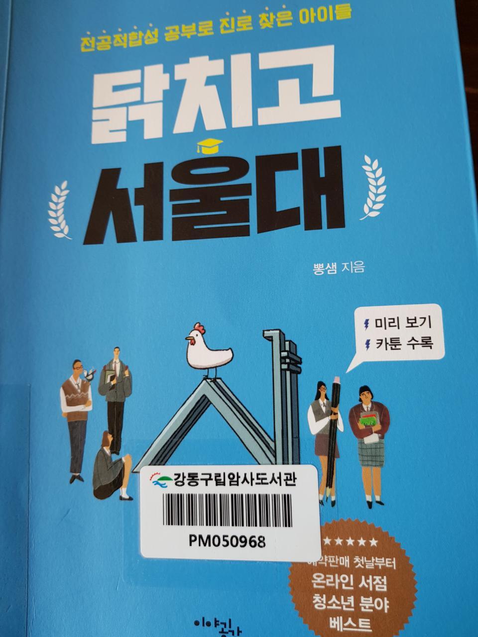 거리 두기 3단계로 문을 닫았던 도서관이 다시 문을 열었다. 기존 대여 도서 반납도 할 겸 신간이 뭣이 나왔을까 궁금하여 도서관을 방문했다. '닭치고 서울대'란 책이 오늘의 도서판에 전시되어 있길래 얼른 집어 들었다. 초판 인쇄가 2020년 11월 11일이다. 요즘 트렌드는 어떨까 하는 호기심 발동이다. 같이 간 언니가 애들 서울대 다 졸업했는데, 뭣하러 또 서울대 책을 보느냐고 의아해한다.