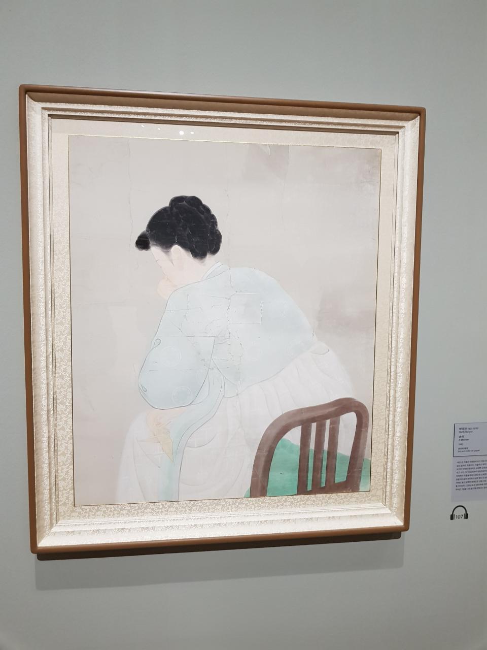 섬세하고 연한 색감이 투명한 느낌이다. 푸근한 한복 주름이 우아함을 준다. 수심에 잠긴 듯 턱을 괸 여인의 한 손에는 종이학이 쥐어져 있다. 이것의 의미는 무얼까. 소원을 비는걸까? 아니면 학처럼 훨훨 날아가고 싶은걸까? 미완의 메시지다.