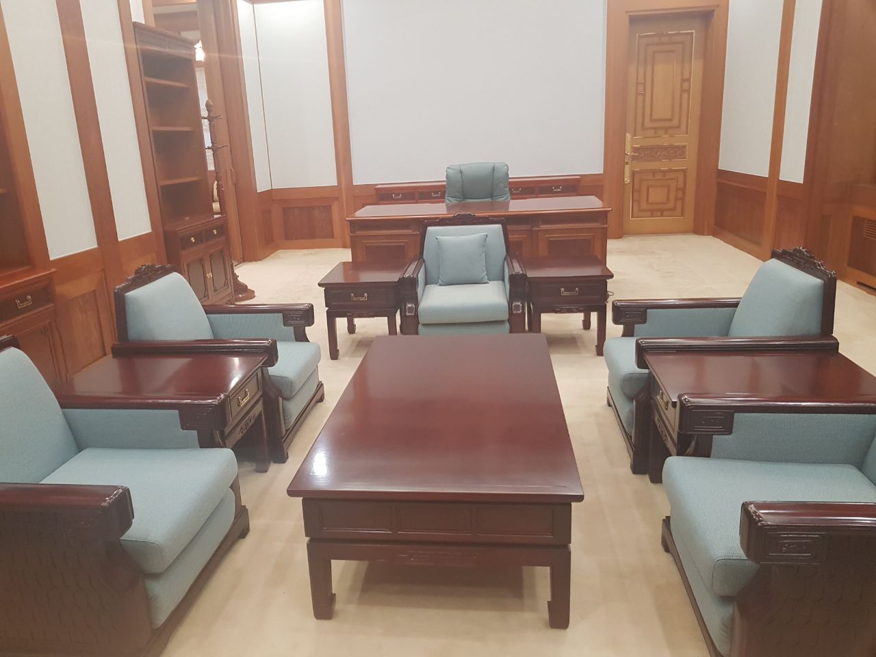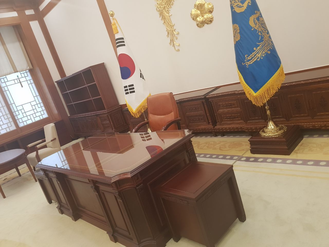 대통령 집무실은 동쪽 벽면은 황금색 십장생 문양으로 장식했고, 창문은 나무 창틀로 한지로 마감하여 한국적 분위기 연출하였다.