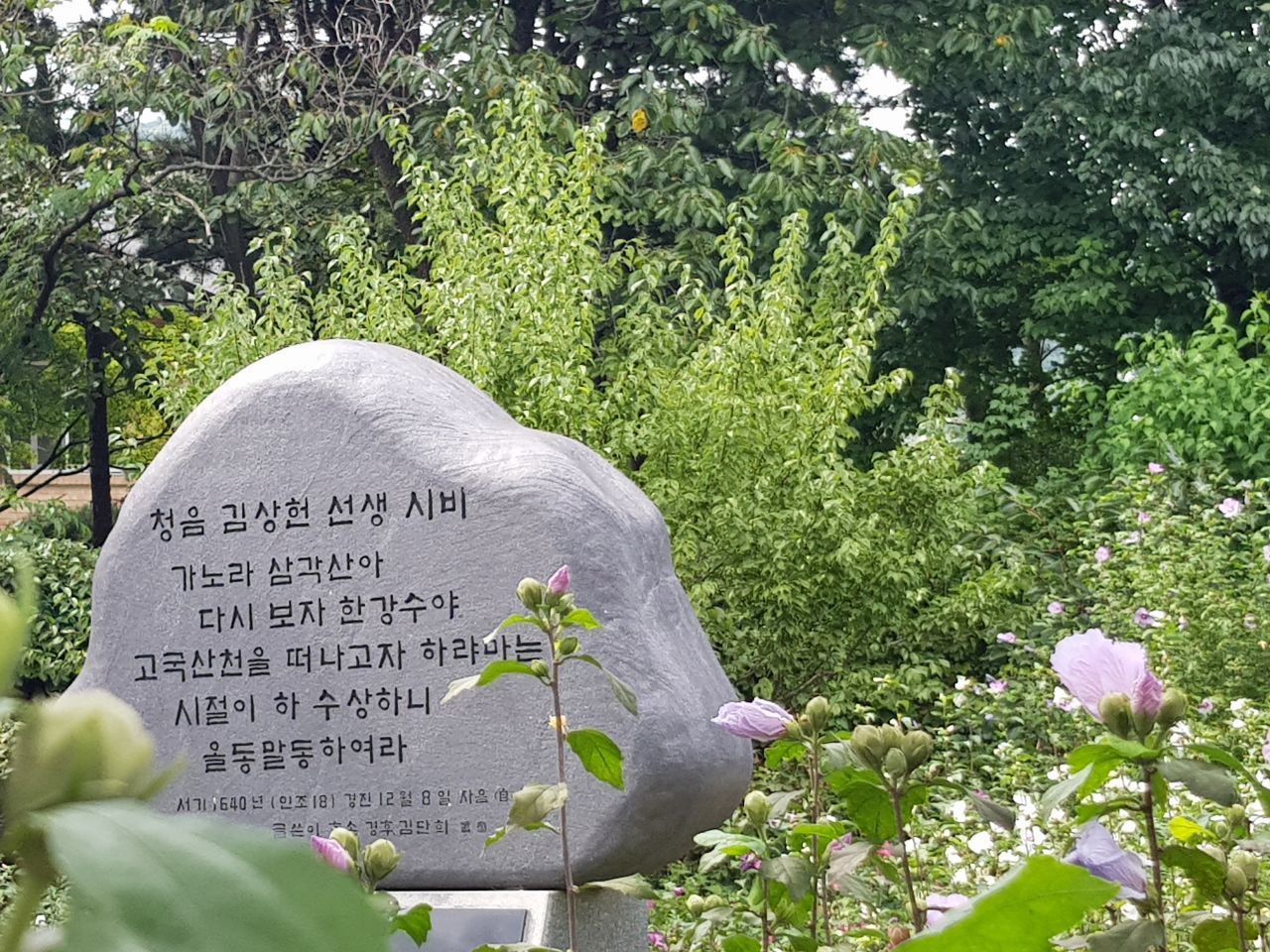 시비를 읽으며, 역사의 소용돌이를 느낀다. 병자호란 때 청나라에 대항해 끝까지 싸울 것을 주장하던 작가가 전란 후에 소현세자와 봉림대군과 함께 청나라에 볼모로 잡혀가게 되었을 때 고국을 떠나면서 비분강개한 심정을 노래한 시조다. 특별히 김상헌 님의 시비가 세워진 건 ,그 일대 땅이 김씨들 땅이었기 때문에 궁정동 안가를 지을 때 후손이 기부했기 때문이라는 설이 있다.