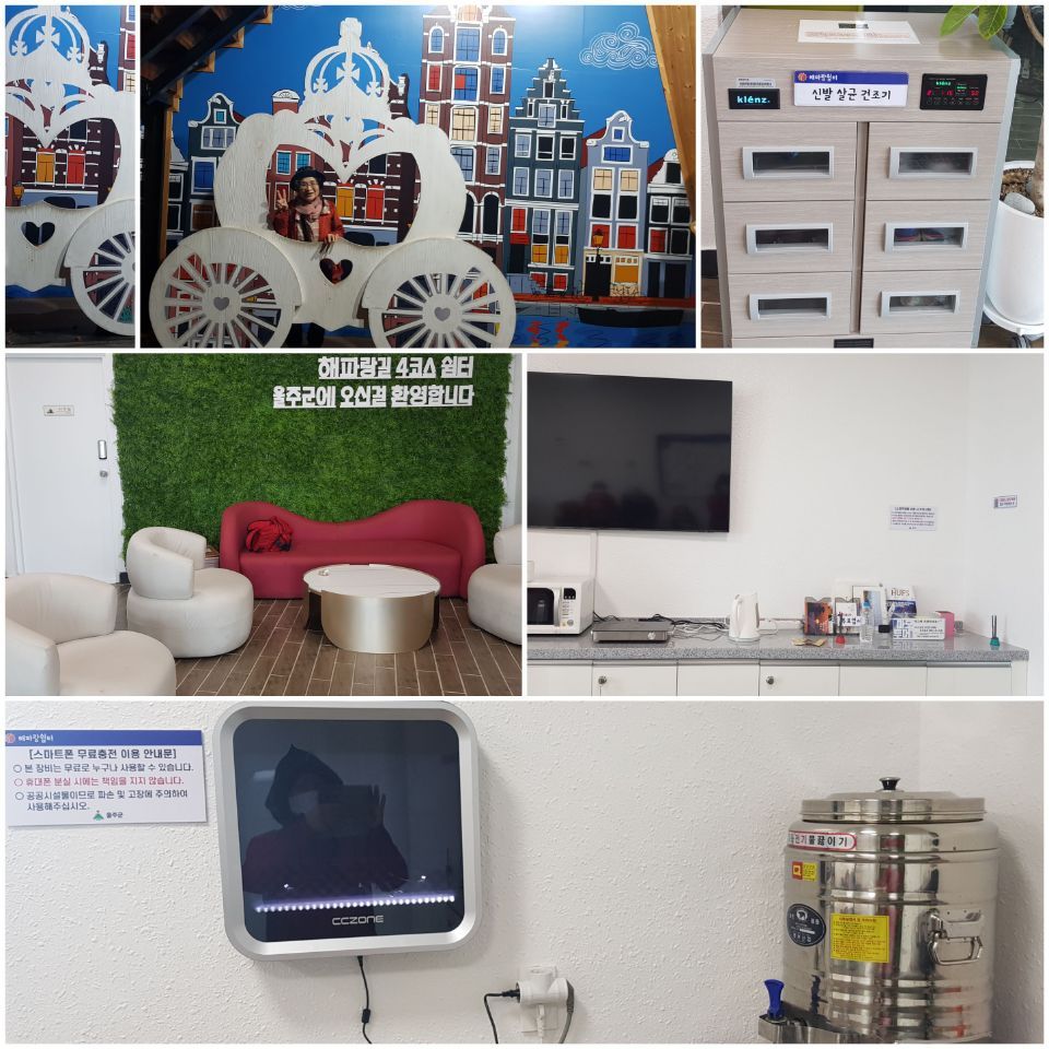 우리는 간절곶 쉼터에 뛰어들었다. 그런데, 맙소사! 이게 웬일? 신발 건조기가 딱 비치되어 있지 않은가. 거기다가 다리 안마기까지. 벽면에는 땡큐카드가 빼곡하다.