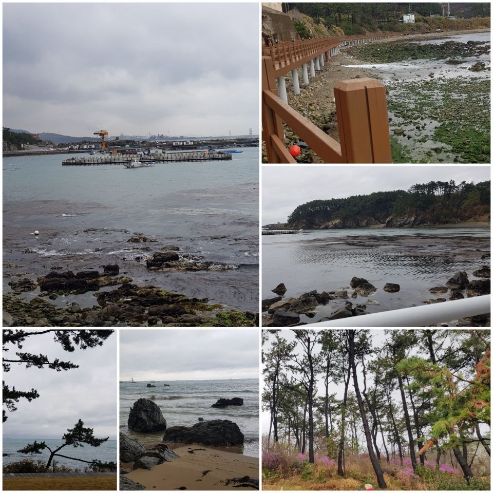 해파랑길 리본을 따라 진하 출렁다리를 걷는다. 처음에는 출렁다리 난간을 잡고 어정쩡하게 무서워했으나 이젠 두 손 놓고 잘도 다닌다. 이래서 경험이 필요하다. 먼 산에도 꽃들이 희고 붉고 노랗게 물들었다. 멀리서 당겨 찍어보니 흐릿하다. 산에 꽃 무리가 좋아서 희미함에도 소개하고 싶다. 해안 길 따라 조성된 데크 길이 옛날 철길같이 길게 연결되어 있다. 반경 2미터나 됨직한 하수처리 배관에서 폭포처럼 하수가 쏟아지니 주위가 오염되어 녹조와 검은 기름때가 보기 흉하다. 울산 중공업 단지에서 자체 정화해 내보내겠지만, 바닷물이 오염되어 생물에겐 치명적이겠다. 해파랑길의 유일한 단점이기도 하다. 눈살을 찌푸리게 하는 이곳에 조성된 이 운치 있는 데크가 아까울 지경이다. 조금 더 지나가니 수십 개의 배관이 꽁무니를 드러내고 있다. 공무원이 더 자주 출동해서 조치할 일이다.