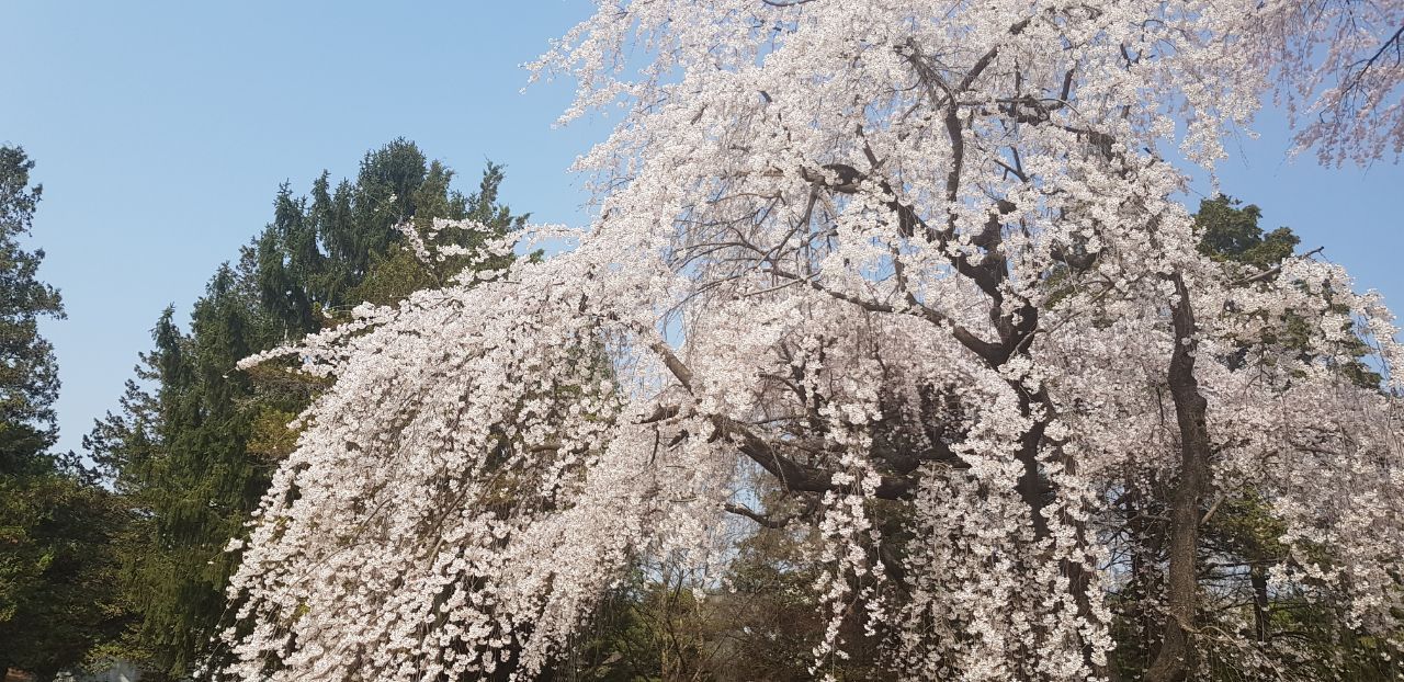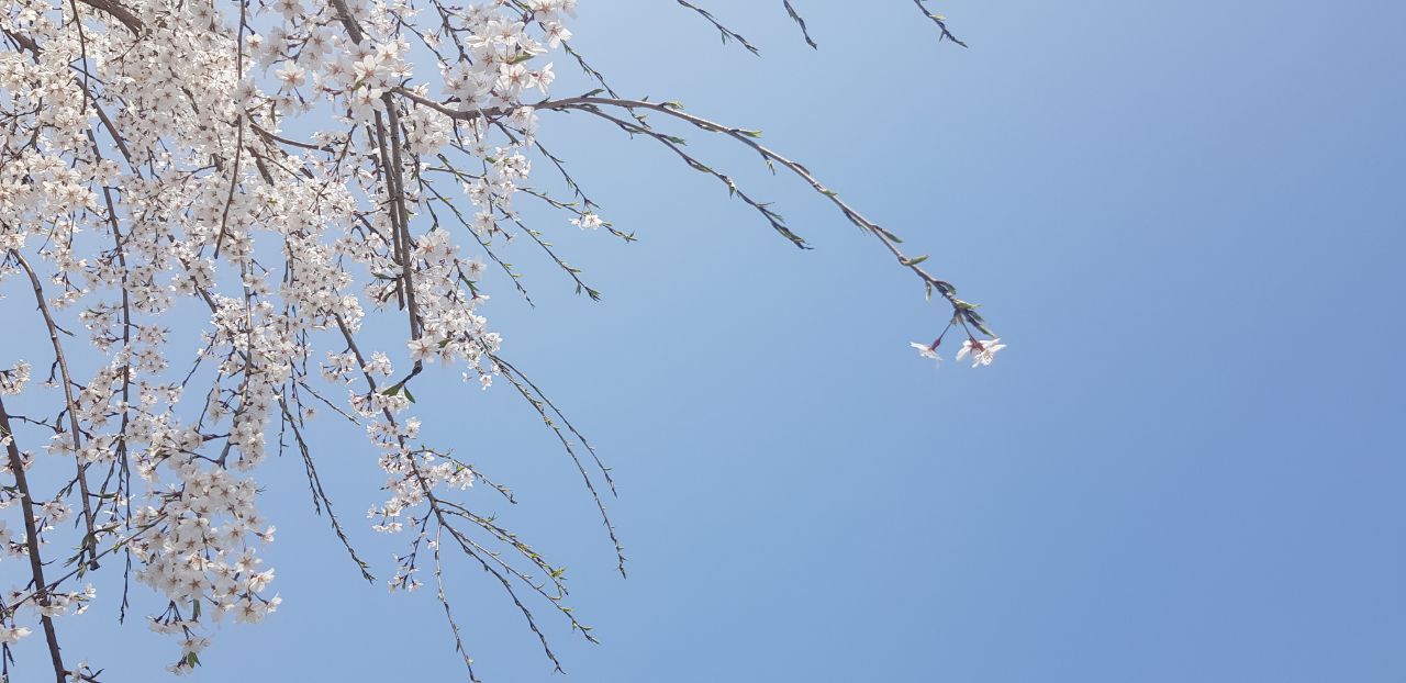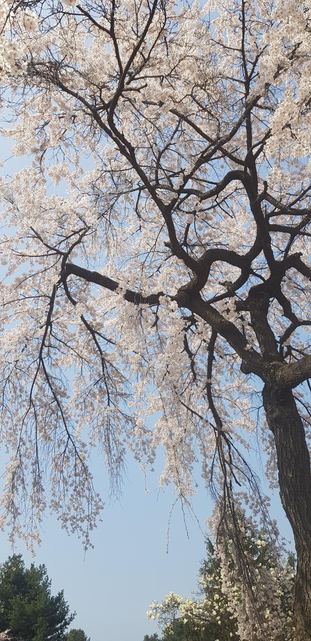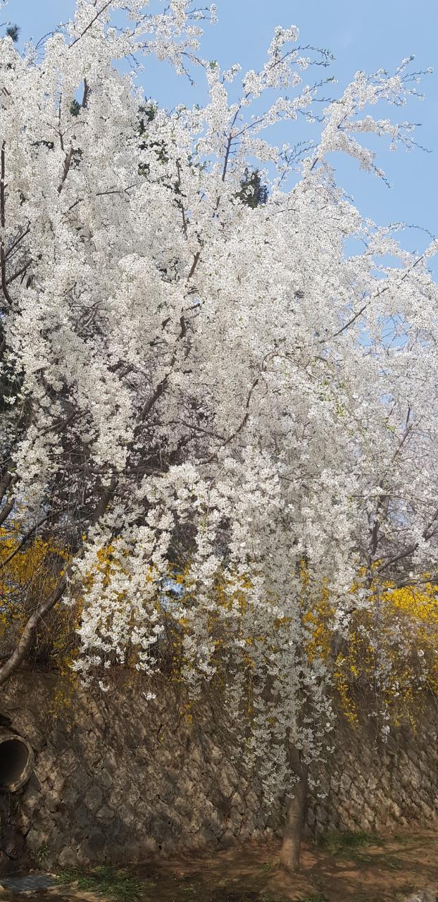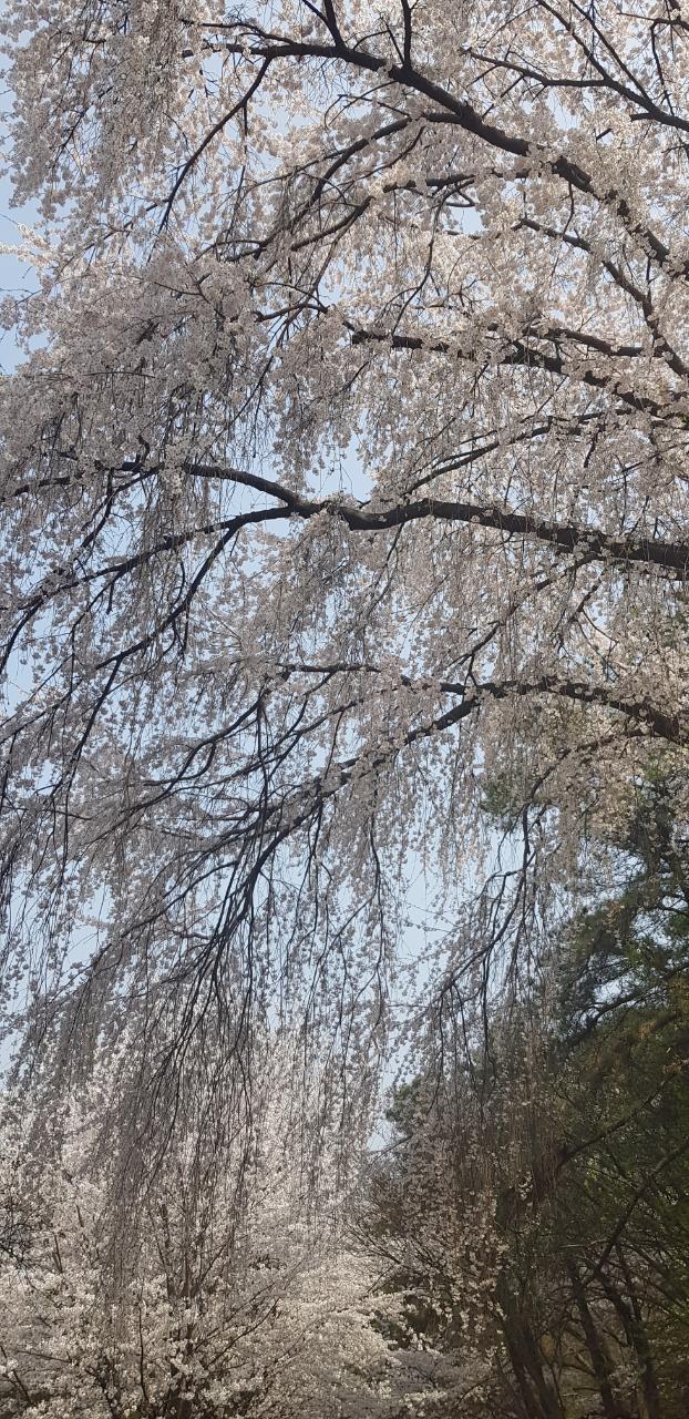 흰빛이 얼마나 강렬한 지 노란 개나리가 종종 종종 외쳐봐야 눈에 잘 띄지 않는다. 그 아름답던 분홍빛 꽃도 수양벚꽃 흰빛 앞에서는 주눅이 들어 진가를 발휘하지 못한다. 흰빛과 초록의 대비가 더 산뜻하다. 아직은 연둣빛이지만, 초록을 향한 무한대의 희망으로 가슴을 적신다.