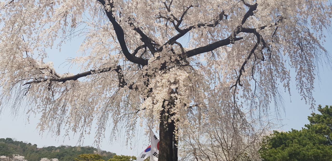 국립현충원에서 동작문협 시화전이 열렸다. 회원 시낭송회도 겸한다. 오후 세 시가 개막식이지만, 언니 두 분과 오전 11시에 만났다. 시화를 관람 후 봄꽃이 만발한 산으로 오른다. 만개한 수양 벚꽃은 재질이 유리 같은 착각을 일으키며 반짝인다. <봄에 피는 꽃들은 겨울 눈꽃의 답장>이라던 오토쿠니의 하이쿠 한 줄이 생각난다. 이 어마어마한 벚꽃이 정녕 겨울 눈꽃의 답장일까. <보이는 것 모두 꽃, 생각하는 것 모두 달>이라던 바쇼의 글처럼 정말 눈에 들어오는 것은 벚꽃뿐이다.