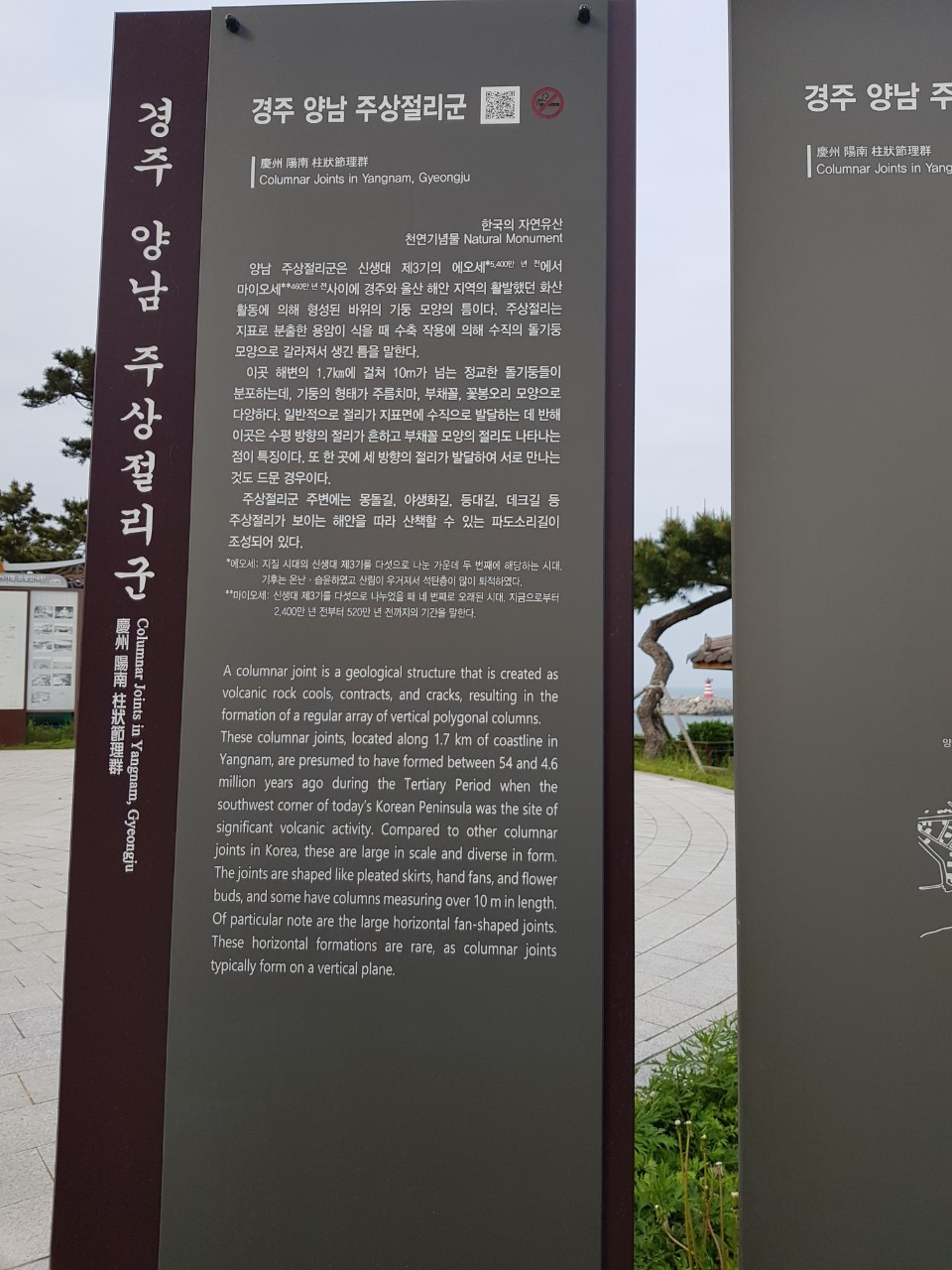 경주 양남 주상절리군은 경주와 울산 해안 지역의 활발했던 화산 활동에 의해 형성된 기둥 모양의 바위틈이다. 지표로 분출한 용암이 식을 때 수축 작용에 의해 수직의 돌기둥 모양으로 갈라져서 생긴 틈을 말한다. 기둥의 형태가 주름치마, 부채꼴, 꽃봉오리 모양 등 다양하다. 일반적 절리는 지표면에서 수직으로 발달한 데 반해 이곳은 수평 방향의 절리가 흔하고 부채꼴 모양으로 나타난 점이 특징이다. 이것은 용암 연못이 굳으면서 갈라진 흔적이라고 한다. 땅 위로 흐르는 용암이 물길을 따라 흐르다가 연못처럼 둥근 구덩이에 고이면, 용암이 식은 이후에 현재의 부채꼴과 같은 모양이 될 수 있다.