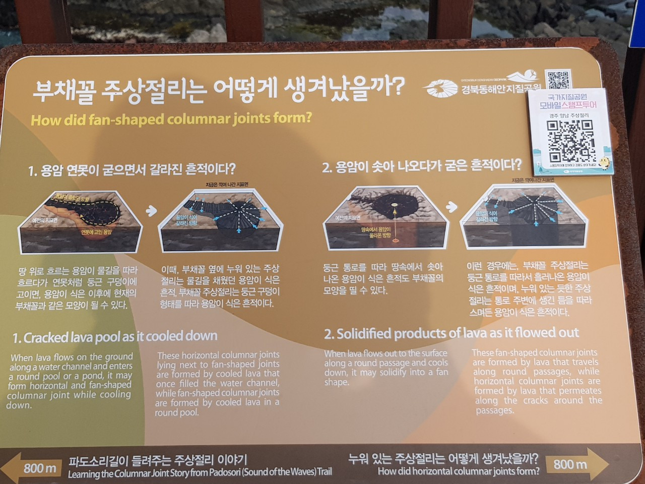 부채꼴 옆에 누워있는 주상절리는 물길을 채웠던 용암이 식은 흔적이며, 통로 주변에 생긴 틈을 따라 스며든 용암이 식은 흔적이다.