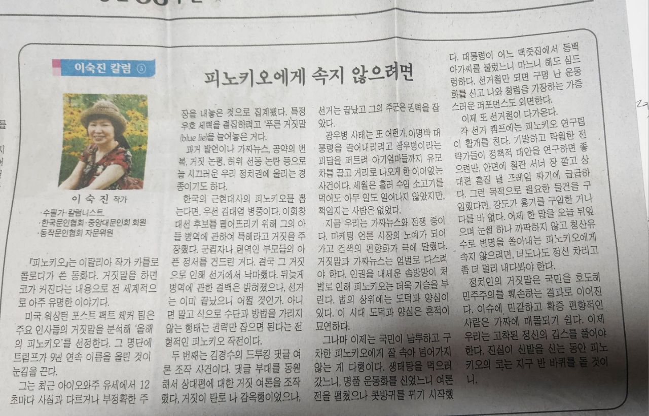 지금 우리는 가짜뉴스와 전쟁 중이다. 마케팅 언론 시장의 노예가 되어가고 검색의 편향화가 극에 달했다. 거짓말과 가짜뉴스는 엄벌로 다스려야 한다. 인권을 내세운 솜방망이 처벌로 인해 피노키오는 더욱 기승을 부린다. 법의 상위에는 도덕과 양심이 있다. 이 시대 도덕과 양심은 흔적이 묘연하다. 그나마 이제는 국민이 남루하고 구차한 피노키오에게 잘 속아 넘어가지 않는 게 다행이다. 생태탕을 먹으러 갔느니, 명품 운동화를 신었느니 여론전을 펼쳤으나 콧방귀를 뀌기 시작했다. 대통령이 어느 맥줏집에서 동백 아가씨를 불렀느니 마느니 해도 심드렁하다. 선거철만 되면 구멍 난 운동화를 신고 나와 청렴을 가장하는 가증스러운 퍼포먼스도 외면한다. 이제 또 선거철이 다가온다. 각 선거 캠프에는 피노키오 연구팀이 활개를 친다. 기발하고 탁월한 전략가들이 정책적 대안을 연구하면 좋으련만, 안면에 철판 서너 장 깔고 상대편 흠집 낼 프레임 짜기에 급급하다. 그런 목적으로 필요한 물건을 구입했다면, 강도가 흉기를 구입한 거나 다를 바 없다. 어제 한 말을 오늘 뒤엎으며 눈썹 하나 까딱하지 않고 청산유수로 변명을 쏟아내는 피노키오에게 속지 않으려면, 너도나도 정신 차리고 좀 더 멀리 내다봐야 한다. 정치인의 거짓말은 국민을 호도해 민주주의를 훼손하는 결과로 이어진다. 이슈에 민감하고 확증 편향적인 사람은 가짜에 매몰되기 쉽다. 이제 우리는 고착된 정신의 깁스를 풀어야 한다. 진실이 신발을 신는 동안 피노키오의 코는 지구 반 바퀴를 돌 것이니.