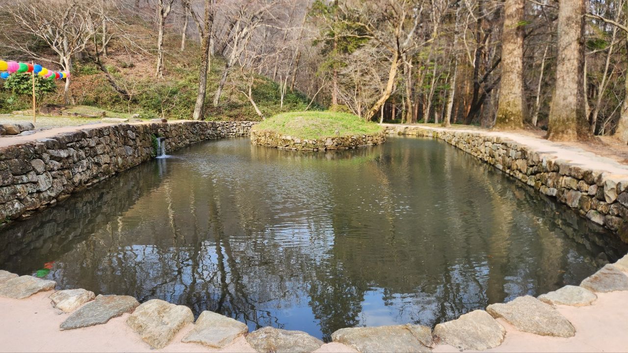 왼쪽 계류의 쪼르륵 졸졸 물소리가 정겨워 어깨춤을 추며 설렁설렁 올라가니 작은 연못이 보인다. 연못 속에는 작은 인공섬이 있다.