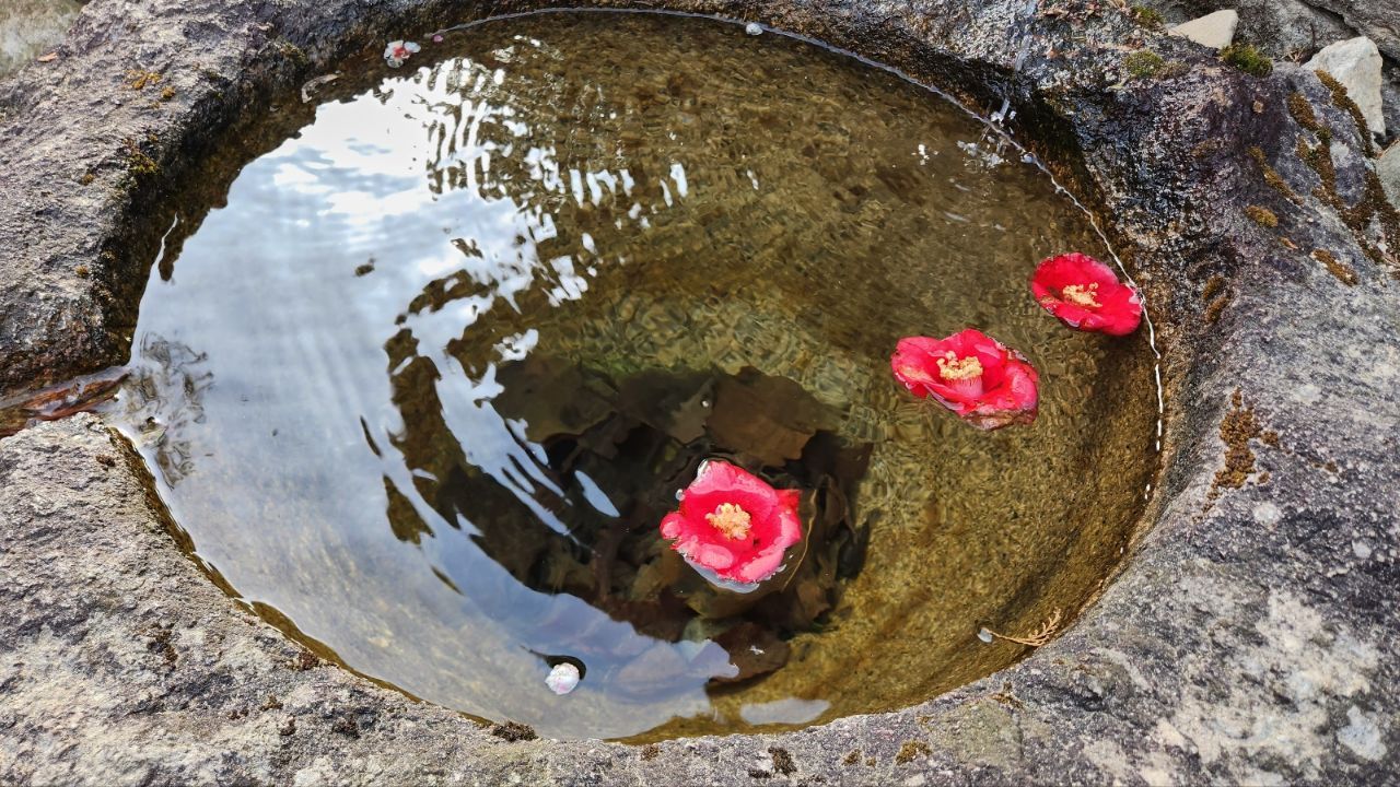 경내 돌절구에 물이 가득 흐른다. 동백이가 스스로 내려앉은 건가. 직박구리가 물어다 놓은 걸까. 동백 세 잎이 나란하다.
