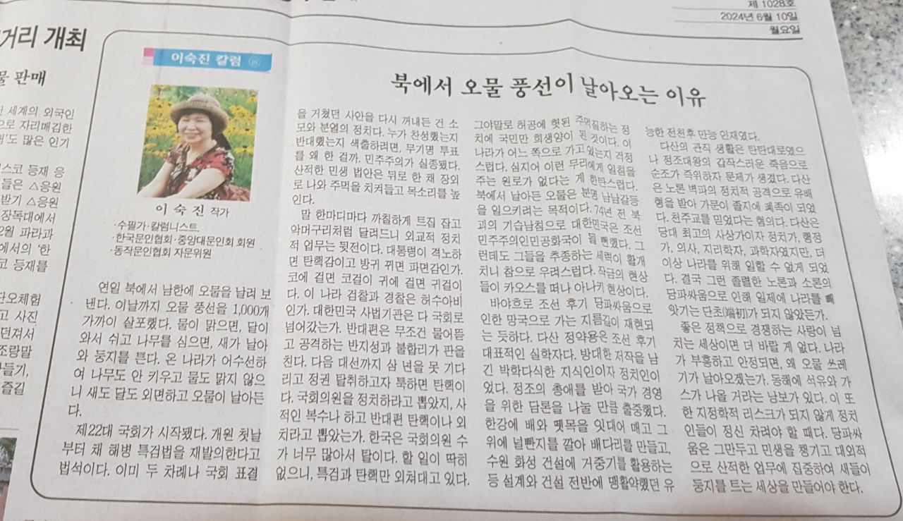연일 북에서 남한에 오물을 날려 보낸다. 이날까지 오물 풍선을 1,000개 가까이 살포했다. 물이 맑으면, 달이 와서 쉬고 나무를 심으면, 새가 날아와 둥지를 튼다. 온 나라가 어수선하여 나무도 안 키우고 물도 맑지 않으니 새도 달도 외면하고 오물이 날아든다.