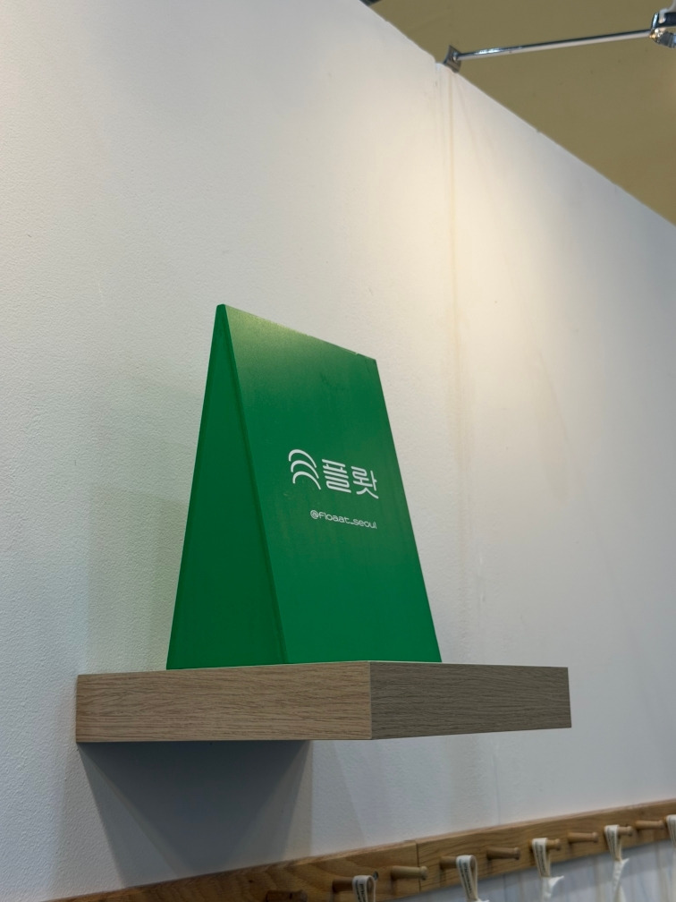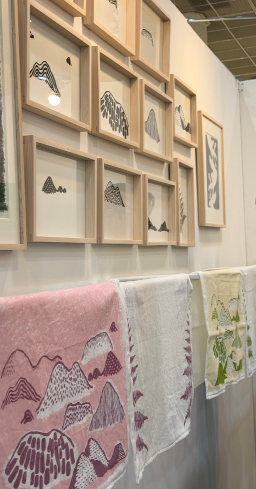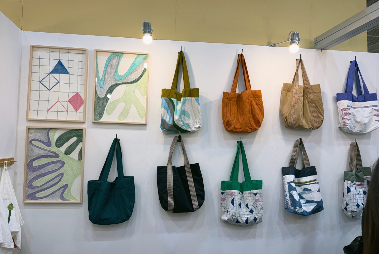 섬유예술을 전공한 이현경 대표가 이번 전시에 <플뢋>이란 브랜드로 참여하면서 초대해줘서 12월 13일 전시장을 관람하게 되었다. 2025년에 플뢋 브랜드 런칭한 재료는 섬유, 종이, 가죽, 패션,/장신구 등이다. 플뢋은 핸드메이드 패브릭 소품 브랜드로 스크린 프린트, 염색, 자수 등 여러가지 섬유 공예 기법을 응용하여 제품을 만든다. 플뢋이란 브랜드명은 직조용어 <Float>로 부터 만들어졌다. Float는 직물이 직조 될 때 실이 다른 실과 교차되지 않고 위에 떠 있는 부분을 지칭하는 직조용어인데, Float를 응용하여 직물에 여러가지 문양을 표현하는 거라고 한다. 플뢋 부스에 도착하니 벌써 지인들이 관람 겸 응원차 대거 참여하여 성황을 이루고 있었다. 이현경 대표는 미국 로드 아일랜드를 졸업하고, 현재 단국대학교 천안캠퍼스 예술대학 미술학부 공예과에서 (타피스트리와 직조 수입) 강의를 하고 있다.