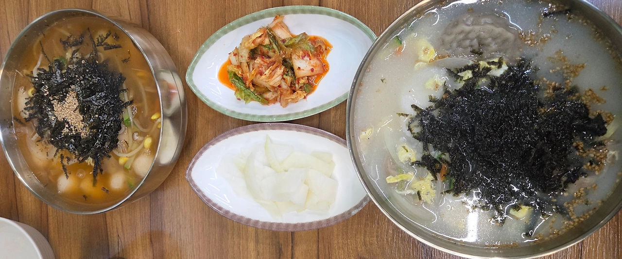 4명은 메밀칼국수, 한 명은 회비빔면, 왕만둣국을 시켰다.