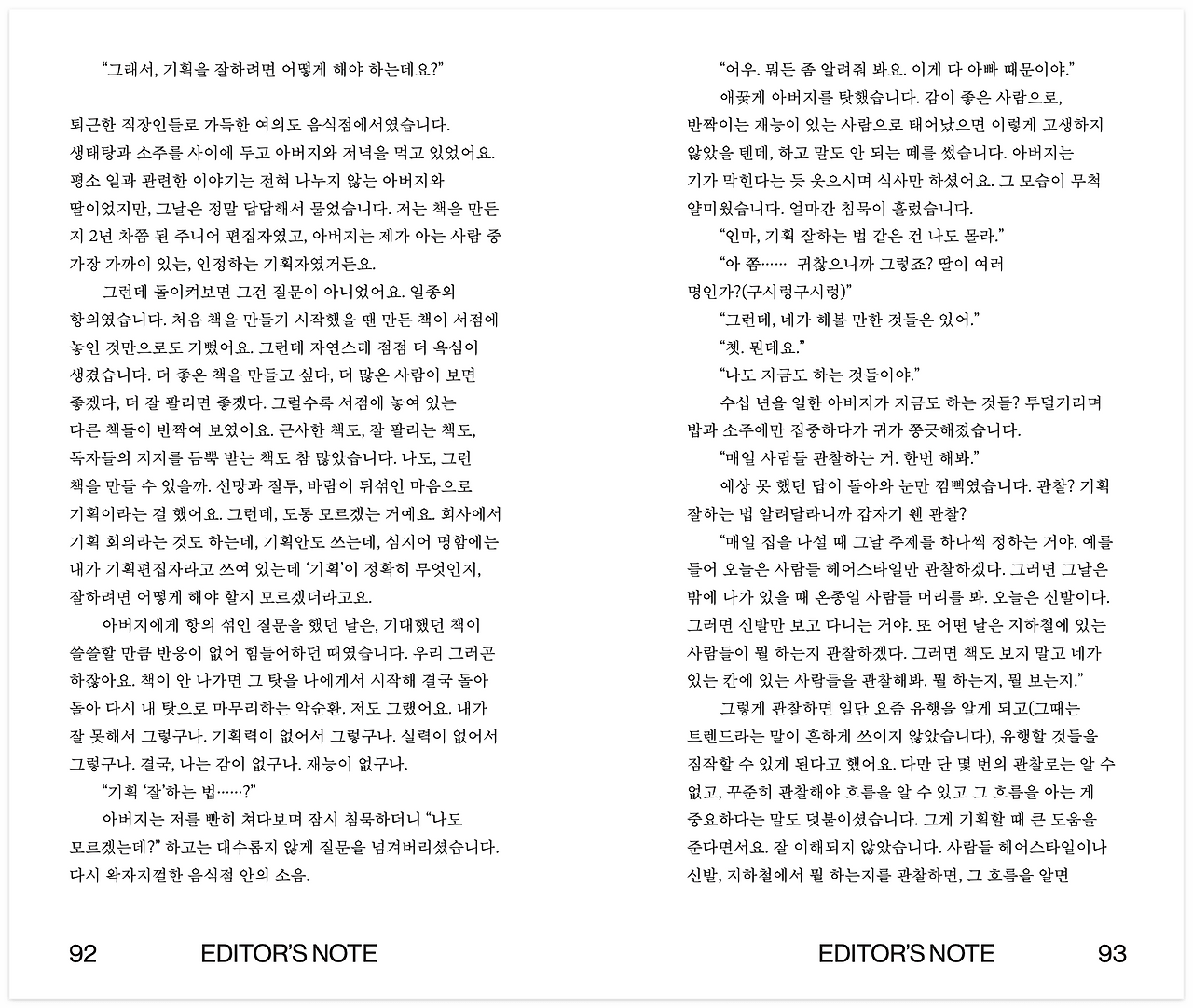 퇴근한 직장인들로 가득한 여의도 음식점에서였습니다. 생태탕과 소주를 사이에 두고 아버지와 저녁을 먹고 있었어요. 평소 일과 관련한 이야기는 전혀 나누지 않는 아버지와 딸이었지만, 그날은 정말 답답해서 물었습니다. 저는 책을 만든 지 2년 차쯤 된 주니어 편집자였고, 아버지는 제가 아는 사람 중 가장 가까이 있는, 인정하는 기획자였거든요.