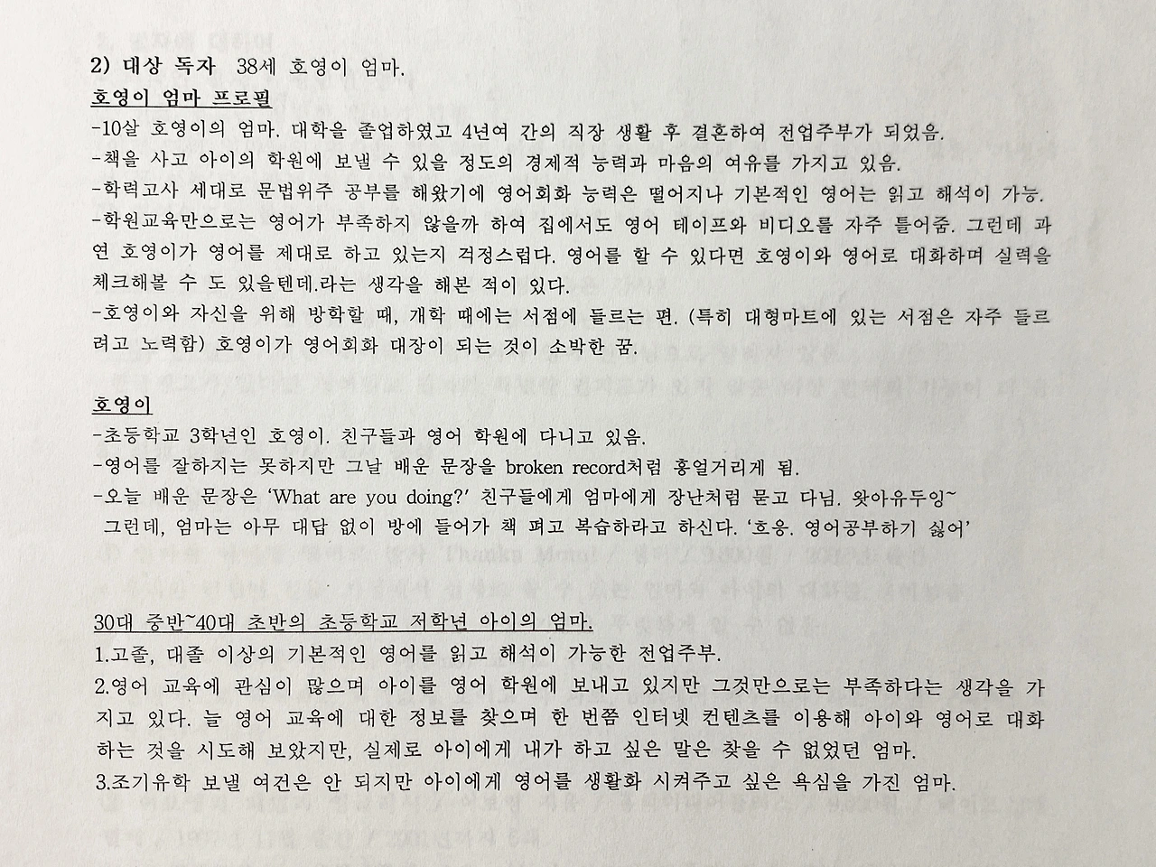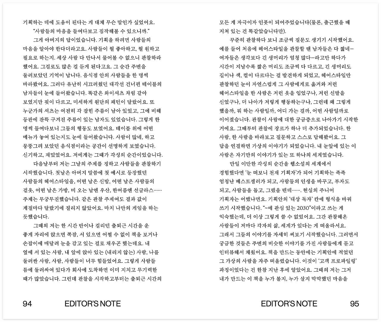 만일 이만한 각성의 순간을 웹소설의 세계에서 경험했다면 ‘눈 떠보니 천재 기획자’가 되어 기획하는 족족 엄청난 베스트셀러가 되고, 사람들의 인생을 바꾸고, 부자도 되고, 사람들을 돕고, 그랬을 텐데… 현실의 주니어 기획자는 어땠냐면요. 기획안의 ‘대상 독자’ 칸에 형식을 바꿔 쓰기 시작했습니다. “~에 관심 있는 2030”이라고 쓰는 게 익숙했는데, 더 이상 그렇게 쓸 수 없었어요. 그간 관찰해온 사람들이 저마다 각자의 삶, 세계가 있다는 게 떠올라서요. 그래서 그들의 이야기를 자세히 써보기 시작했습니다. 그러면서 궁금한 것들은 주변의 비슷한 이야기를 가진 사람들에게 묻고 인터뷰해서 채웠어요. 책을 만드는 동안에는 기획안에 적었던 그 가상의 사람을 자주 떠올렸습니다. 이것이 ‘고객 프로파일링’ 과정이었다는 건 한참 지난 후에 알았어요. 그때의 저는 그저 내가 만드는 이 책을 누가 볼지, 누가 살지 막막했던 마음을 어느 정도 해결한 걸로도 ‘기획’ 주변을 맴도는 안개를 조금 걷은 듯해서 덜 답답하고, 불안했던 것 같아요.