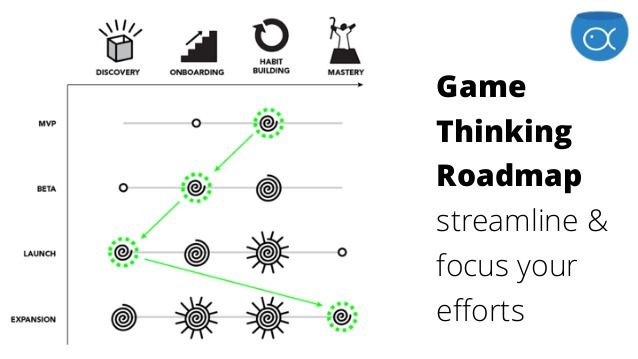 게임 싱킹 로드맵은 가로축을 게임 싱킹 프로세스, 다른 한축은 MVP베타 론칭 확장 버전 같은 제품/서비스 개발 단계로 구성한다. 매트릭스의 첫 번째 가로 교행은 MVP, 최소 존속 제품을 위한 프로세스에 할애한다. 이 과정의 게임 싱킹은 일회적이지 않고 순환 사이클을 통해 디자인 수정과 측정을 반복하는데, 일련의 과정을 거치면서 재생산된 제품/서비스가 베타, 론칭, 확장 버전으로 발전하게 되는 것이다.
