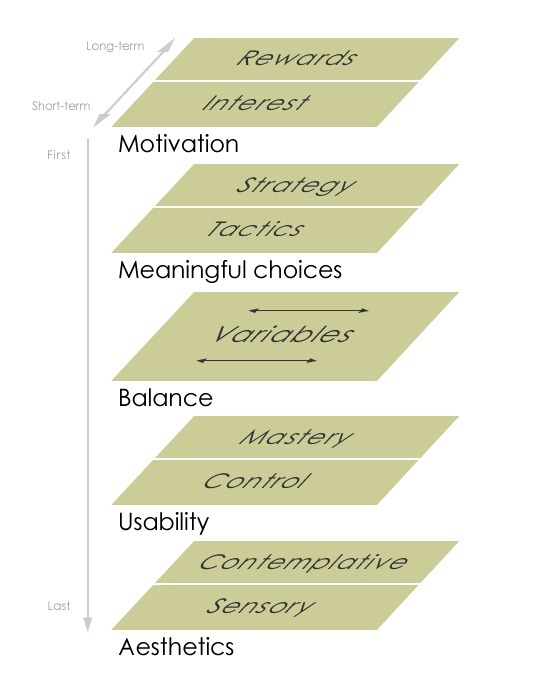 <놀이적 디자인(Playful design)>의 저자 존 페라라(John Ferrara)는 제시 게러트 (Garrett J. Jesse)의 경험 디자인 구조화 기법을 차용하여 PX를 위한 새로운 프레임워크를 제안하였다. 페라라의 프레임워크는 모티베이션, 의미 있는 선택, 밸런스, 사용성 그리고 미학을 PX 기본 레이어로 삼으며 각각을 다시 장단기 세부 요소로 나누어 수직 구조화시키는 것이 특징이다. 처음(first)에서 끝(last)으로 이어지는 순차는 디자이너가 게임 혹은 게임화 매체의 PX 구조화를 위해 먼저 정의해야 하는 형식과 관련이 있다. 디자이너는 플레이어가 이 게임을 통해 무엇에 흥미를 느끼고, 어떤 것을 보상으로 여기며 동기를 강화할 것인지를 먼저 고려해야 한다는 의미다. 반면, 플레이어는 디자이너의 설계 순차와 반대 방향에서 PX 경험을 시작하게 된다. 플레이어들은 게임 전체를 관통하는 이해에 이르기 전에 게임을 감각적으로 인식하며, 그러한 감각에 대한 수용 여부를 판단함으로써 놀이에 참여한다. 이제 디자이너의 관점을 중심으로 PX 프레임워크의 각 층위를 하나씩 살펴보자.