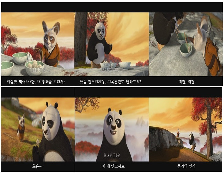 시푸 사부는 포가 쿵푸 마스터로 성장하는데 반드시 필요한 훈련을 표면적으로는 서로 아무 연관도 없어 보이는 만두 먹기 놀이의 맥락과 전략적으로 결합시켰다.
