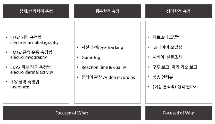 PX 측정법은 크게 생리/생체학(Physiological methods), 행동학(Behavioral method), 심리학 (Psychological mothod) 측면의 3가지 방법론을 기반으로 발전하고 있다.