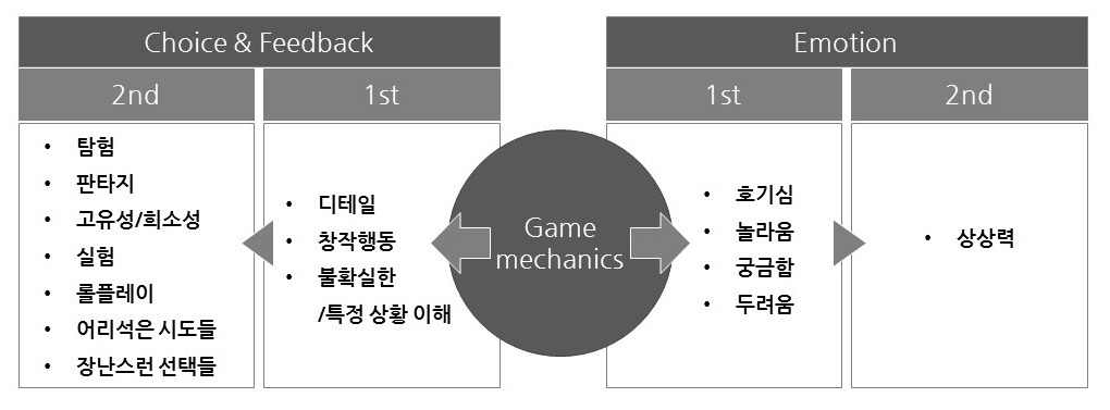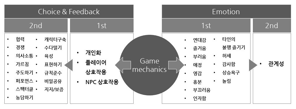 정서적 반응에 개입하는 행동 A-1은 플레이어마다 서로 다른 계열적 개인화 경험, 플레이어 간 상호작용, NPC와의 상호작용으로 요약된다.