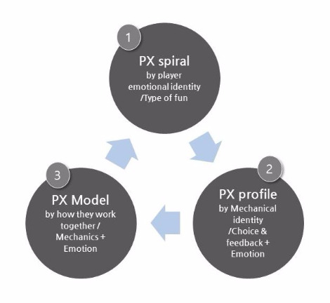 PX 디자인 프로세스를 PX 나선, PX 프로필, EMC 개별 요소들을 통합하는 PX 모델의 구조화 개념으로 정의한 것이다. 이 가운데, 게임 싱킹의 핵심 원리로써 정서와 행동의 구조화 영역에 해당하는 PX 프로필에 주목할 필요가 있다. 따라서 이어지는 절을 할애하여 4가지 재미 유형에 근거한 PX 프로필의 특징을 살펴본다. 본 아티클에 활용된 도식은 라자로의 연구 논문과 저서 내용을 해석하여 필자가 재구성한 것임을 밝힌다.