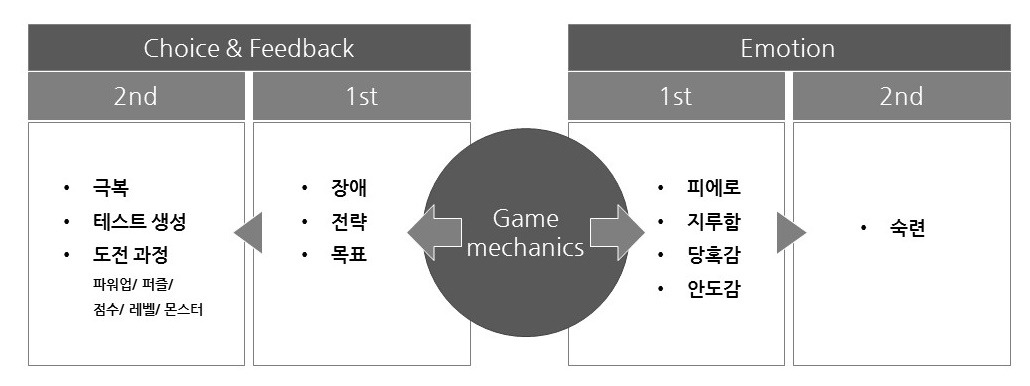 EMC 프레임워크는 메카닉스를 중심에 두고 정서와 플레이어 선택 행동이 각각 1단계에서 2단계로 발전하는 구조 도식에 기반한다. 이를 정서적 발전 단계를 E-1/E-2, 선택 행동적 발전 단계를 A-1, A-2로 기호화하여 살펴보자. 하드 펀에서 E-1은 지루함, 당혹감, 안도감, 그리고 피에로(Fiero)이다. 피에로는 매우 어려운 상황과 장애를 극복했을 때 느낄 수 있는 격한 승리감을 뜻한다. E-2는 앞서 언급한 것처럼 숙련에의 기쁨이다. 각각의 정서 경험에 대응하는 선택 행동 A-1은 장애 인식, 전략 수립, 목표 설정이며, A-2는 장애 극복, 테스트 생성, 파워 향상, 퍼즐 풀이, 점수 획득, 레벨 업, 몬스터 격퇴 같은 도전 과정으로 정의할 수 있다.