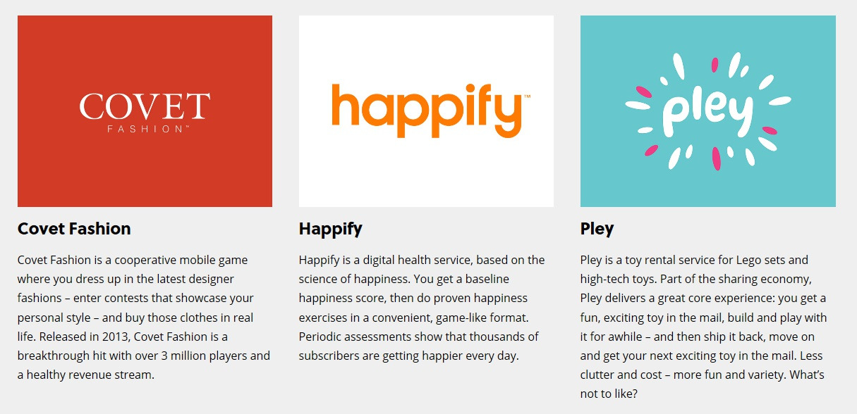 게임 싱킹 적용 사례는 새로운 디자인 프로세스 도입을 촉진하는 기대감 상승 목적보다, 적용 과정 중 실패를 줄이기 위해 필요한 효과적 운용법이나 주의사항 준비에 도움을 주는 학습 자원이 된다는 점에서 더욱 중요하다. 이렇듯, 공개 사례가 부족 상황에서 게임 싱킹 컨설팅 기업 ‘게팅 투 알파(Getting 2 alpha)’의 기업 프로젝트 소개는 방법론 교육과 활용 지식 공유 차원에서 참고 자료로 유용하다. 홈페이지에는 코빗 패션(Covet fashion), 해피파이(Happify), 플레이(Pley), 이베이(eBay), 더심즈(The sims) 등 다양한 기업들이 이미 게임 싱킹을 활용하고 있음을 알리고 있다. 그중 코빗 패션의 게임 싱킹 적용 사례를 요약적으로 살펴본다.